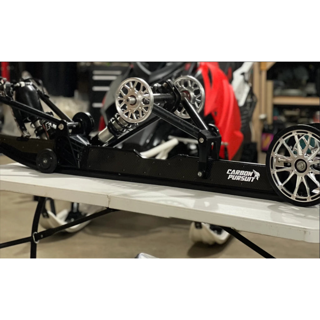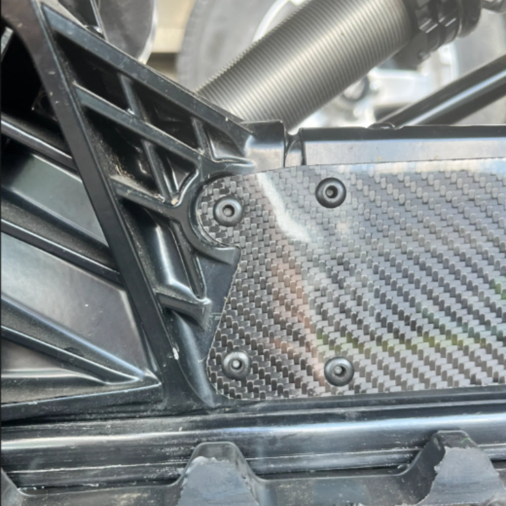 Package includes one front rail brace and a set of rear braces. Front Rail Brace: We set out to develop a solution for the known weak area at the front of the Arctic Cat Alpha rail. In the process we developed the industries first and only continuous 1 piece front brace that wraps the top of the Alpha Rail and ties into the main suspension location. This solution is something that could only be achieved by the use of composite materials as aluminum is unable to wrap the top of the rail and follow the contours of the monorail in the way our carbon material can. Made from Aerospace grade Carbon Fiber prepreg material this brace is extremely lightweight and provides the strength and stiffness where you need it. Install can be done without removing your suspension. Simply remove the limiter strap where it connects to the Alpha rail, remove the front shock, and the necessary wheels and our brace will drop right onto the front of your rail. High strength Stainless steel rivets are provided. We suggest the use of a battery or air rivet gun to make install smooth. Rear Rail Brace: Our rail brace for the Arctic Cat Alpha is created out of high performance prepreg carbon fiber material. This ensures the optimal fiber to resin ratio providing our customers with the best strength to weight ratio of any rail brace. We have created a continuous 1-piece design to distribute loads and reduce stress concentrations to keep your rail from bending. Since our braces are made of lightweight composite materials, no cutouts are required to reduce weight resulting in a stronger brace that is still lighter than aluminum. We have even built our brace using the orientation benefits of carbon fiber weave to ensure strength in all directions for all impacts. Our brace is also designed to stabilize the factory scissor brace mounting block that is prone to failure on stock Alpha rails. Installation is easy as our rail brace covers the length of your rail without interfering with the rear wheels on the snowmobile. High strength stainless rivets are provided in each purchase for installation. Simply drill and rivet our carbon fiber rail brace to the Alpha rail to give yourself a high strength solution with a look that will stand out from the rest.